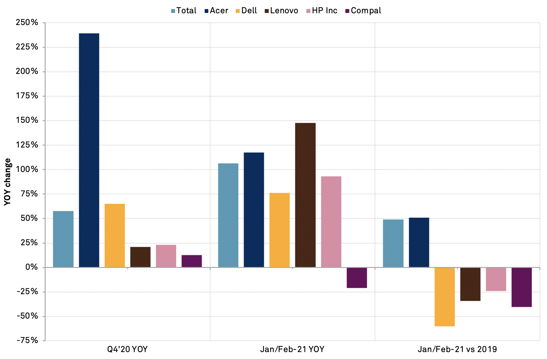 U.S. seaborne imports of computers more broadly climbed by 106.4% in January and February combined, Panjiva’s data shows. Aside from a 117.4% rise in imports linked to Acer there was also a 147.7% rise in imports linked to Lenovo while shipments associated with Dell and HP Inc. rose by 76.3% and 93.2% respectively. Again, some caution is needed with regards to 2020 figures, with shipments linked to Dell, HP and Lenovo all actually lower in January and February 2021 than the same period of 2019.