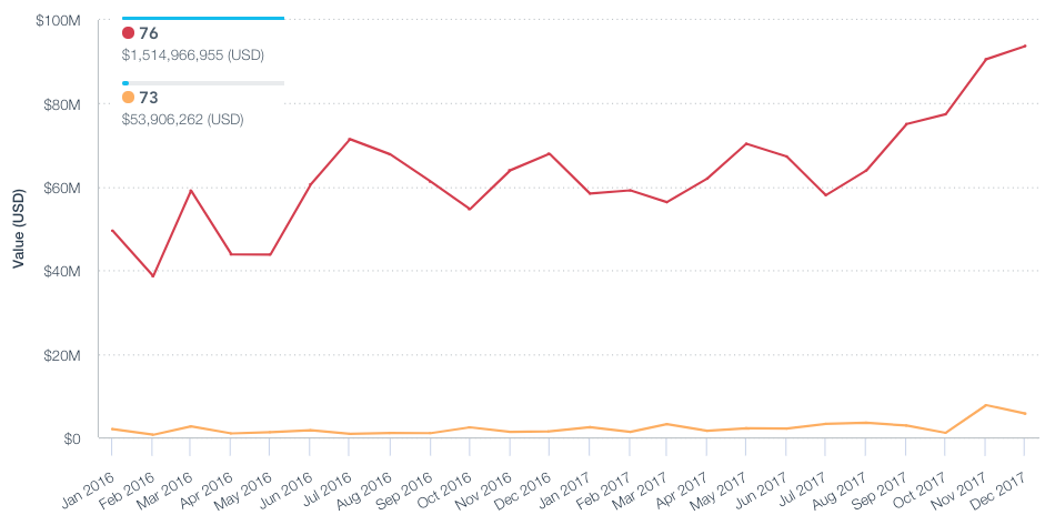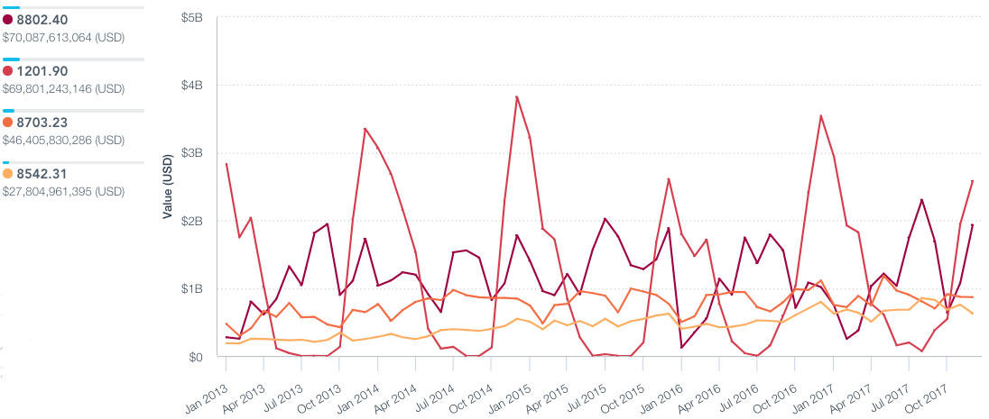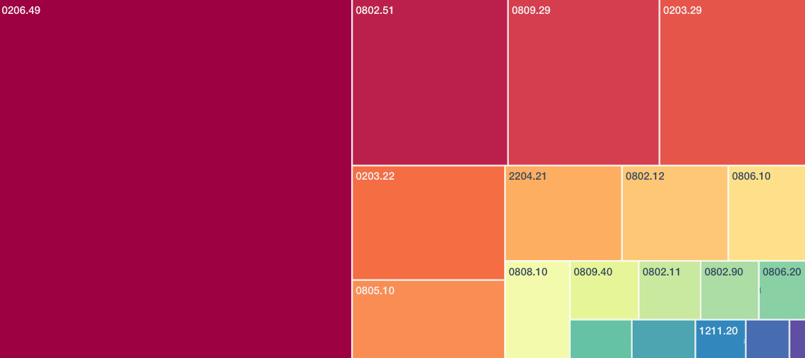 In terms of the agricultural / beverage products the biggest area of coverage is pork products, which accounted for $1.16 billion of the total in 2017. Among the others chestnuts ($175 million), sweet cherries ($170 million) and oranges ($87 million) matter most.