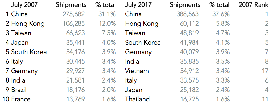 Panjiva data shows the mix of imports to the U.S. has changed radically. China remains the biggest supplier, with more direct shipments from the mainland. Vietnam has emerged as a major manufacturing hub (number 7 from 17), displacing Japan (9 down from 4) as Chinese companies relocate in favor of lower labor costs and – to a lesser extent – more favorable tariff regimes.
