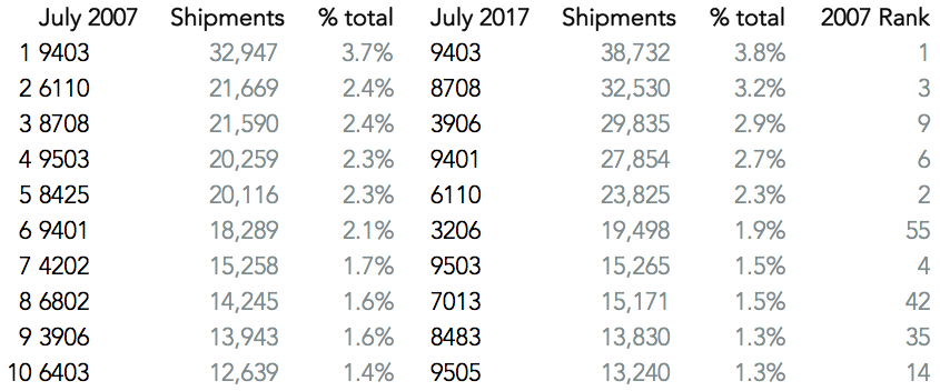 The political landscape in 2017 is dominated by discussion of the loss of American manufacturing. Yet, the biggest gains in the share of products shipped has come from car parts (HS 8708) and paints / pigments (HS 3206). Meanwhile, imports of apparel (6110) have become less important – partly reflecting the emergence of the importance of e-commerce as well as changing consumer habits.