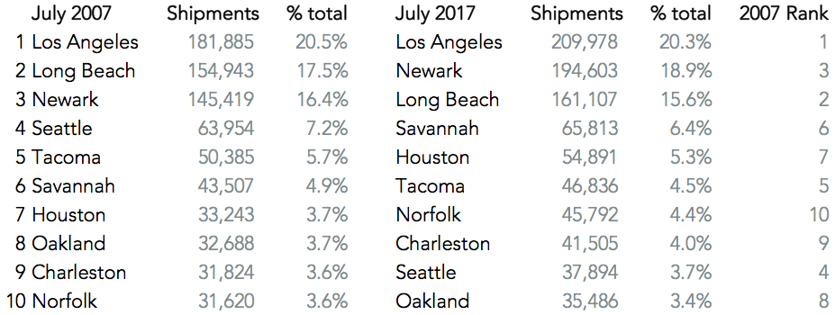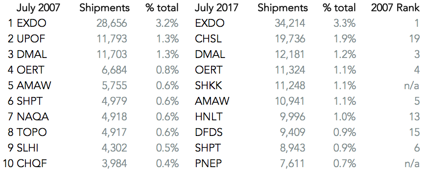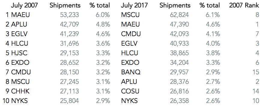 A decade on though international trade is in rude health, including U.S. inbound traffic which breached 1 million shipments for a second time in July, as outlined in Panjiva research of August 7. In five charts, here’s how the shipping landscape has changed in July 2017 vs. July 2007 (the last month before the crash):