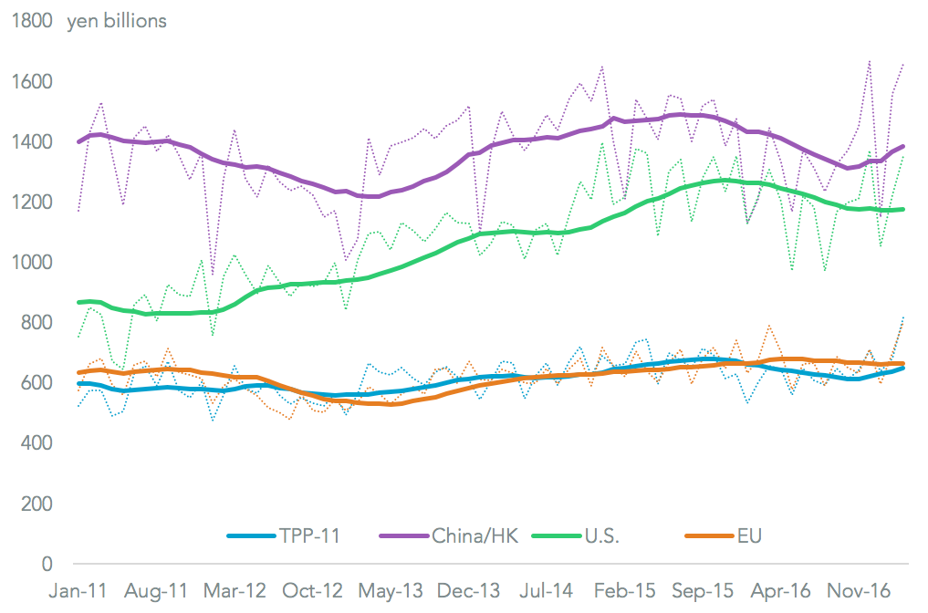 The Japanese government has a busy year ahead trying to secure major trade deals. The TPP group, excluding the U.S., accounted for 7.8 trillion yen ($68.8 billion) of exports in the past 12 months, Panjiva data shows. That was roughly the same as the EU at 7.9 trillion yen, with which Japan has a free trade deal that should be completed by year end. Both accounted for 11% of global exports.