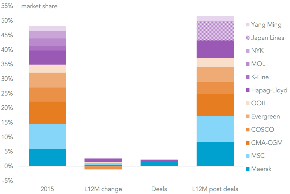 It isn’t clear whether there is room in the current legislative agenda for a change in the law. An ongoing Department of Justice investigation into the container-liner industry further complicates the issue. Panjiva data shows that, in aggregate, the three big alliances accounted for 51.6% of U.S. inbound-volumes over the past 12 months allowing for mergers that have already been announced.