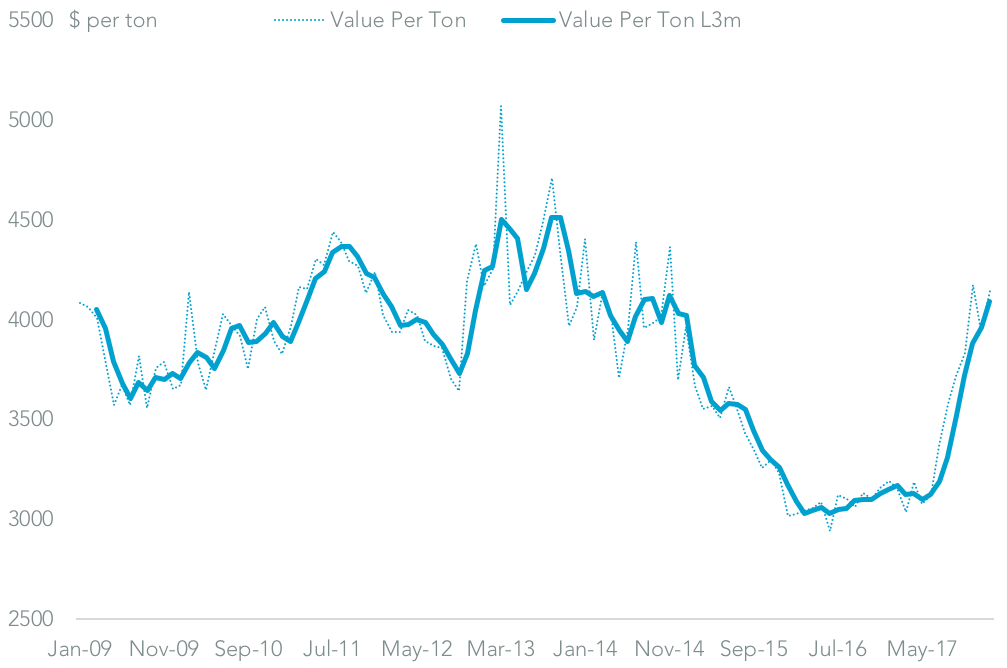 Consumers have paid the price, however, with the average import value per ton – a proxy for price – having risen by 20.2% in January vs. the prior 12 months. That’s before the additional 10% that will come from the section 232 tariffs of course.