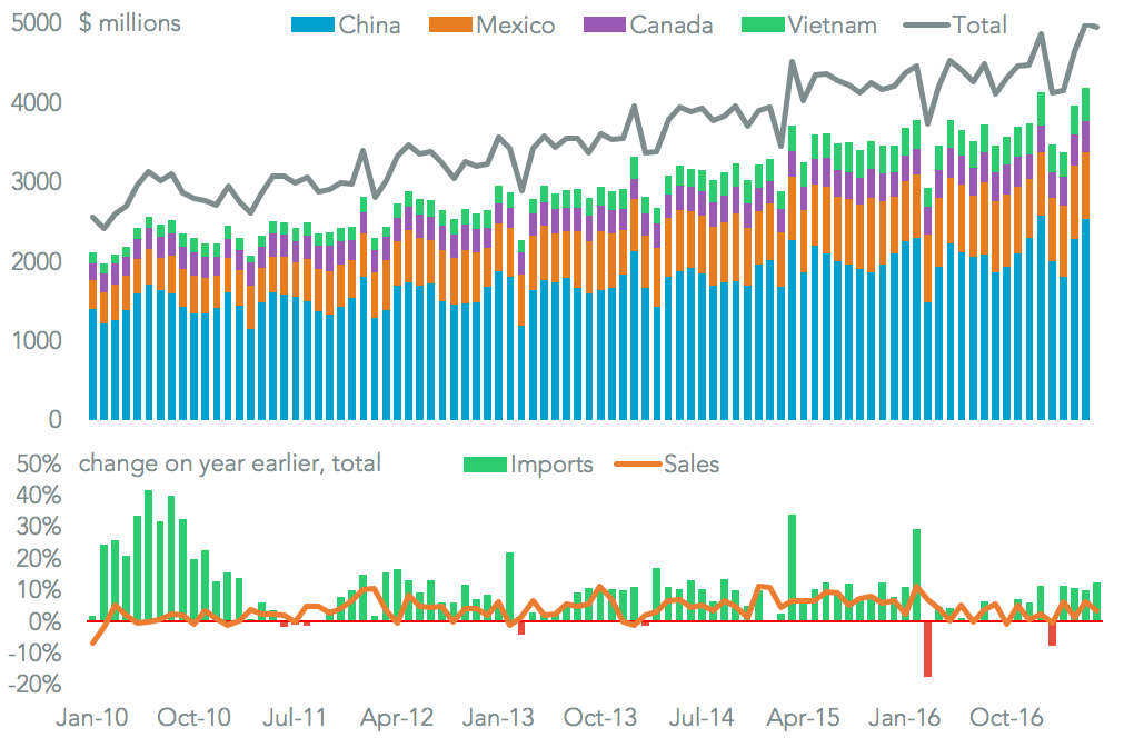 That repeats a pattern seen in other consumer products including appliances and electronics, as outlined in Panjiva research of June 16. In the context of NAFTA negotiations it is also worth noting that the U.S. ran a $8.46 billion “furniture deficit” in the past year, with U.S. exports to Canada and Mexico having fallen 1.1% in May.