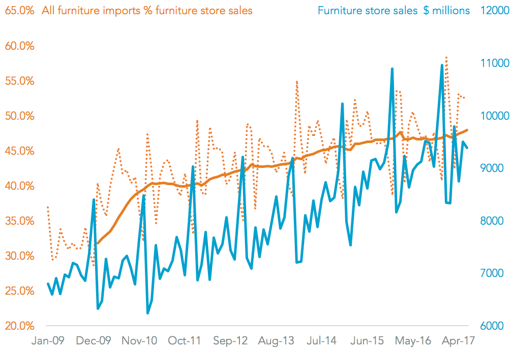 The U.S. furniture retail industry is becoming ever-more reliant on imports. It is notable that the “ Made in America” showcase at the White House included only one furniture producer (cushions). Panjiva analysis of U.S. imports and retail sales data shows imports were equivalent to 52.8% of retail sales by furniture stores in June. That led the 12 month average to 48.0%, the highest since at least 2009.