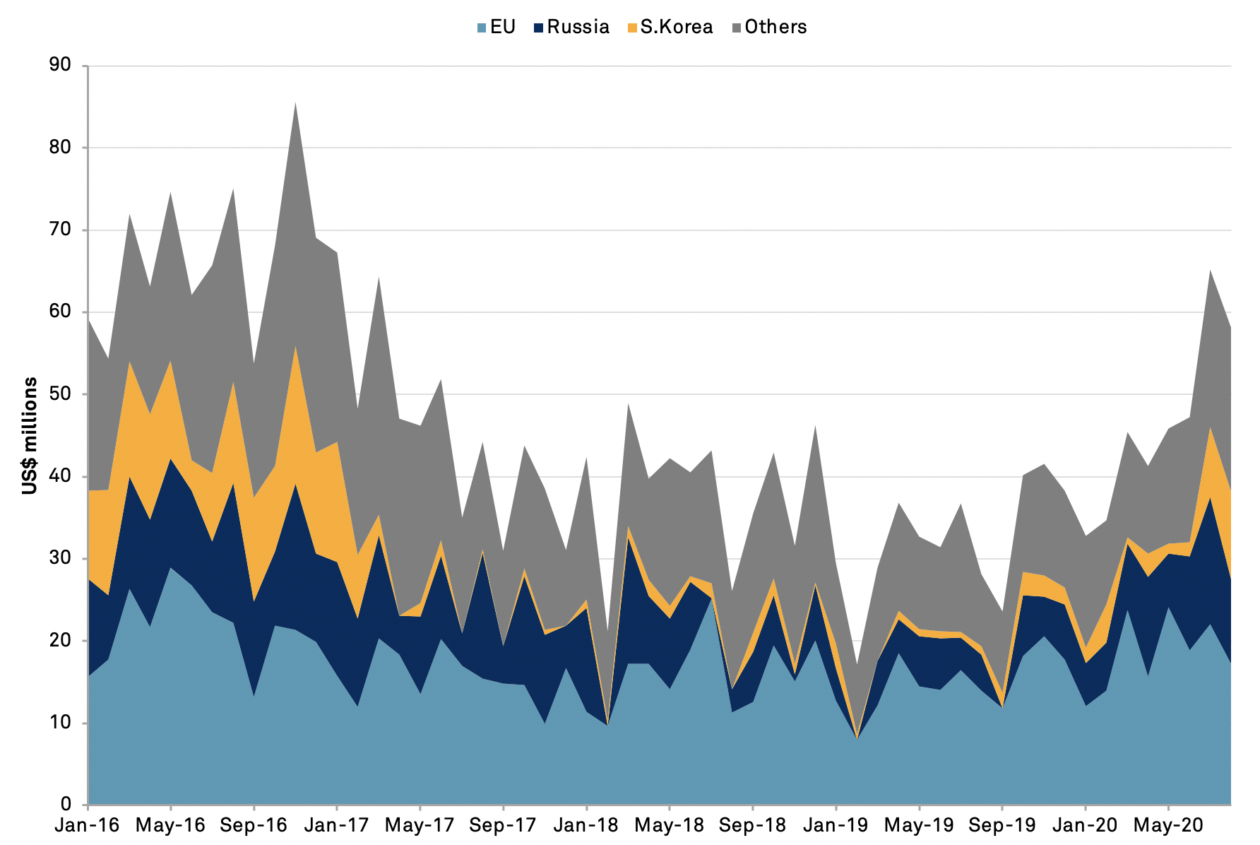 The increase in August was led by a 10-fold increase in shipments from South Korea while shipments from Russia climbed 136%. Shipments from the EU have increased at a more modest rate of 23.6% including U.S. seaborne import shipments linked to Prvi Partizan, Fiocchi Munizioni and the local division of global leader Armscor.
