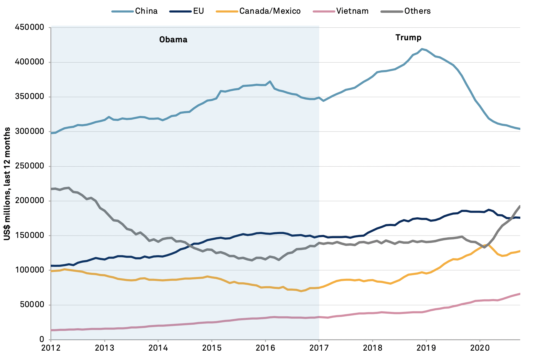 The trade deficit with China dropped to $304.0 billion in the 12 months to Oct. 31 compared to $346.8 billion in 2016 while that with Vietnam climbed to $66.2 billion from $32.0 billion, effectively offsetting 80% of the reduced deficit with China. Similarly the trade deficit with the EU increased to $175.8 billion from $147.6 billion and that with Canada and Mexico climbed to $127.8 billion from $74.3 billion.