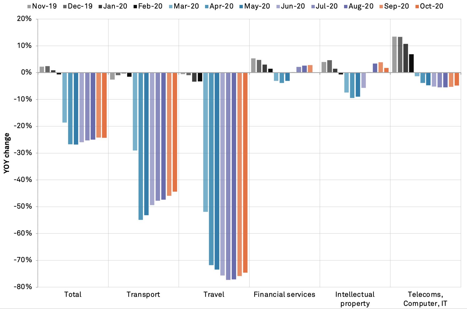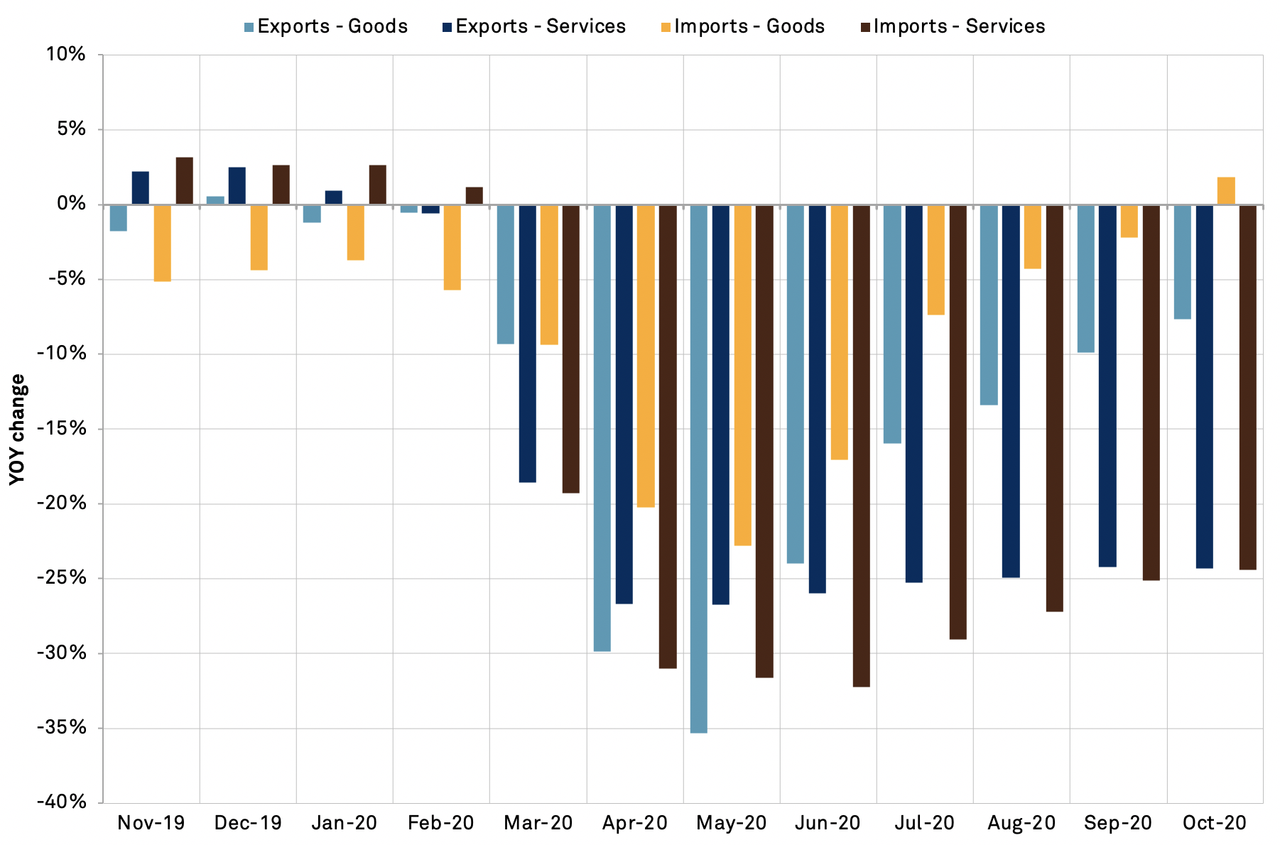 The downturn in services trade was consistent across exports and imports with both declining by just over 24.0% year over year. On the export side the continued absence of international travel has meant transport and travel services are still down by 44.4% and 74.6% year over year respectively. There’s also been a slowdown in the rate of growth in financial services to 0.1%, from 2.9% a month earlier, as well as a slowdown in growth of intellectual property services to 1.8% from 3.9%.