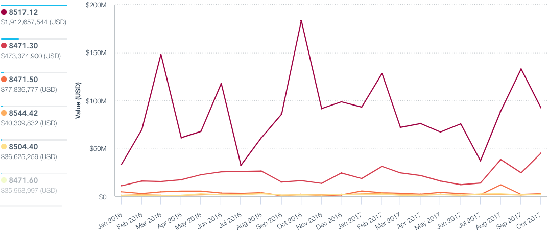 Panjiva data shows Apple’s Indian imports have increased by 9.3% in the three months to October 31 on a year earlier. In terms of products that’s been led by completed handsets outside the SE (68.8%) and its laptop/desktop systems (23.5%).