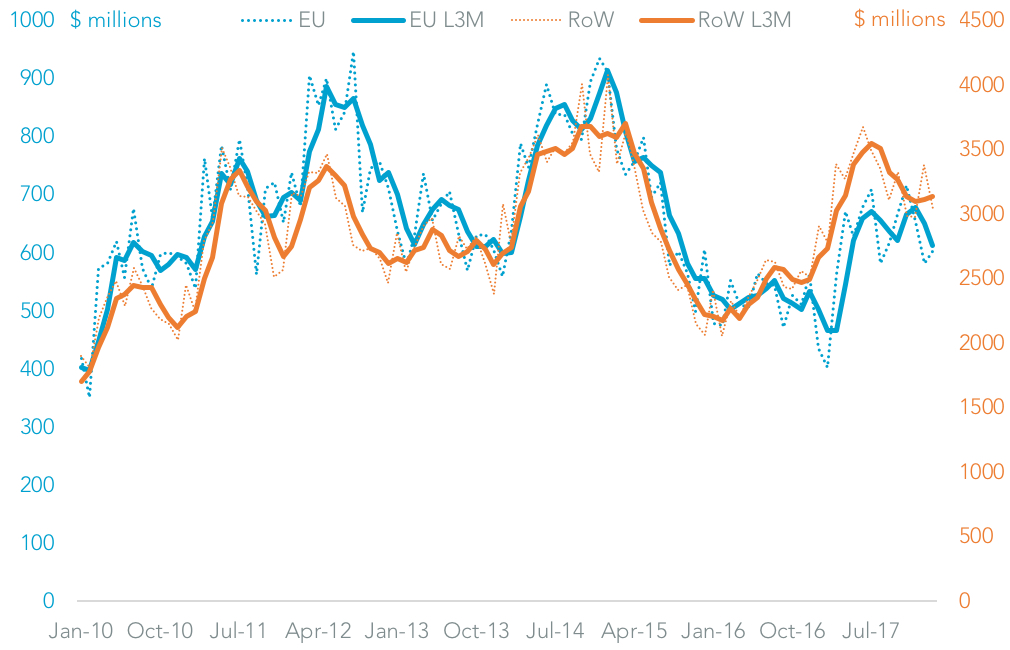 From the U.S. perspective the EU represents the largest potential exemption candidate after Canada (which is tied up in NAFTA negotiations). The EU accounted for 16.3% of U.S. imports of the steel and aluminum products covered in the 3 months to February 28, Panjiva data shows. EU exporters have also taken a more conservative approach than others, with shipments in the three months to February 28 down 8.2% sequentially vs. a 0.1% decline for all others.
