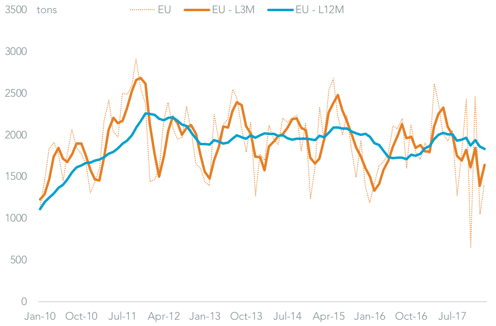 Exports to the EU meanwhile were just 22k tons in the past 12 months after falling 8.5% in the past three months. That was well below quota and likely reflects marketing as well as purely tariff issues.