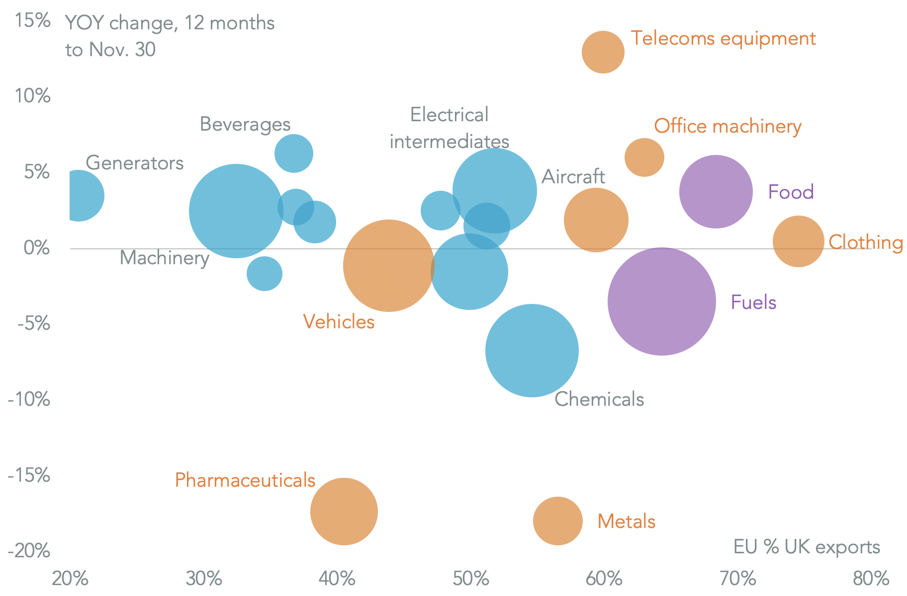 Chart segments U.K. exports to the EU by industry (SITC-1 or SITC-2) in the 12 months to Nov. 30. Bubble size indicates proportion of U.K. export total, colors for emphasis only. Calculations include ONS data. Source: Panjiva