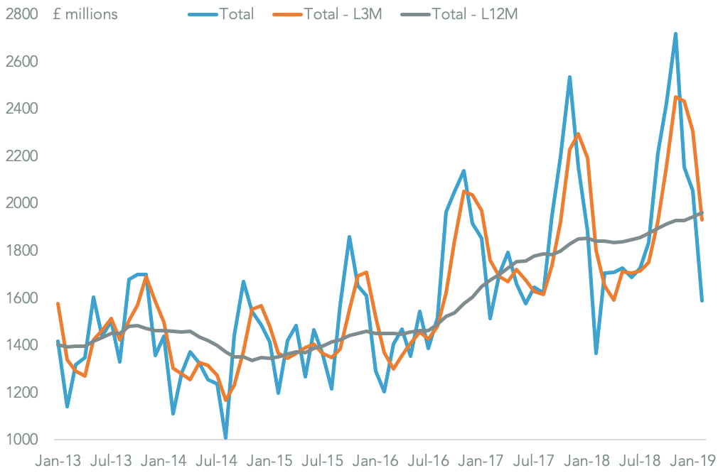 Yet, there’s been a marked acceleration at the start of 2019. Imports of capital equipment – typically telecoms networks – climbed 16.7% year over year in February, up from 11.2% in January and 6.0% in 2018. There’s also been a rapid turnaround in consumer equipment – typically phones – with a 17.1% surge in February after an 8.2% contraction in January. In aggregate imports rose 16.2% in February, up from 9.0% in January.