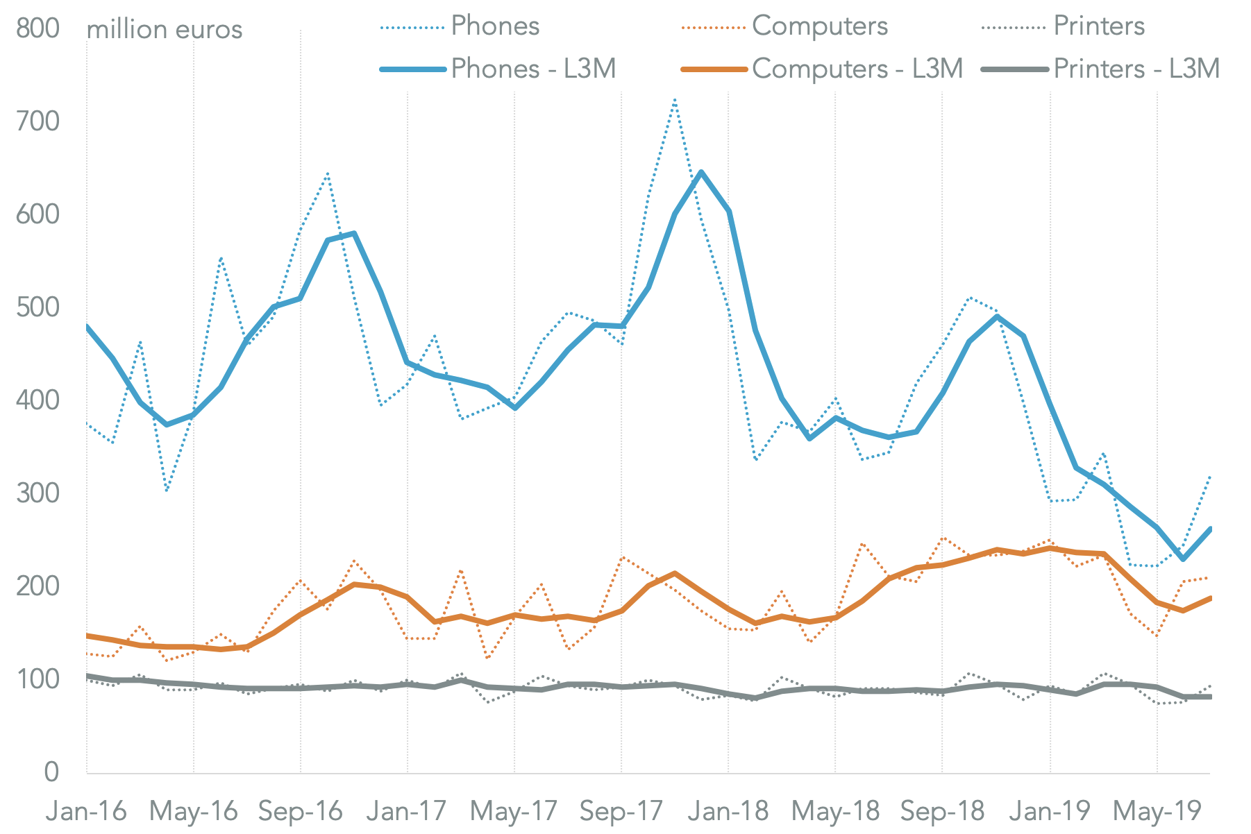 Brexit could have marked impact on electronics supply chains. The leading exported products from the Netherlands to the U.K. in the 12 months to Aug. 31 included phones with 4.24 billion euros exported, representing 8.2% of the total following a 23.7% drop.That was followed by computers with 2.62 billion euros shipped representing 5.0% of the total after a 16.1% improvement. Printers meanwhile represented 1.09 billion euros of exports after a 0.2% improvement.