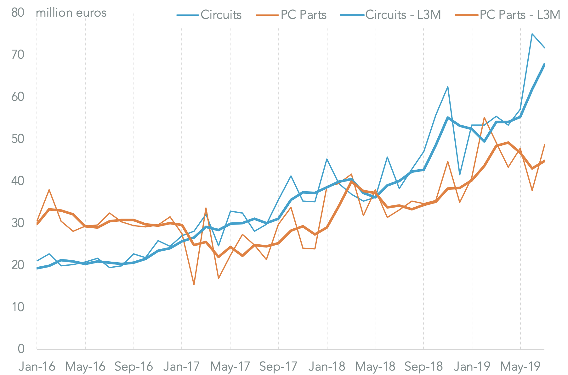 The situation is more complex for electronics components where supply chains can be more closely knit and difficult to rearrange. Exports of components have been growing more quickly than final products. Shipments of electronic circuit systems climbed 47.2% to reach 669 million euros in the 12 months to Aug. 31, while shipments of PC components expanded by 31.1% to 509 million euros.