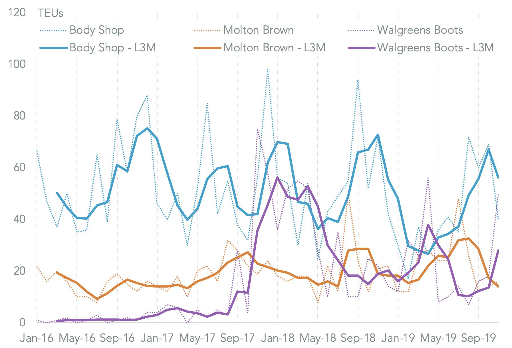 Similarly Kao Corp’s Molton Brown, which was half the size with 260 TEUs of associated shipments fell by 26.3% the past three months, also after a prior surge.