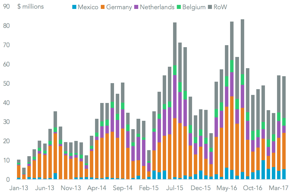 One of the faster growing international markets has been China, which increased imports by 9.6% in the 12 months to April 30. Buyers have so far preferred European brands, though imports from Mexico ( handled by AB Inbev’s local subsidiaries) increased 130.2% in the past year. Even with that growth Mexican beers only accounted for 8.8% of total imports. The steady growth in tequila, which reached 48% in the last quarter alone as outlined in Panjiva research of June 22, suggests growing appetites for both products could continue.