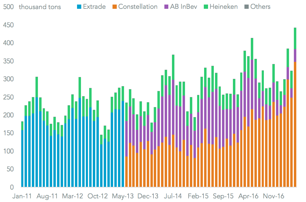 There was a resurgence in Mexican exports to the U.S. in May with a 6.9% rise on a year earlier in volume terms. That was a new high since at least 2011 of 437.4 million liters and comes ahead of the normal seasonal peak of June or July. That still only resulted in an unchanged total for the quarter. Among major shippers Heineken saw a 10.3% drop on a year earlier for the quarter, which came ahead of its distribution deal with Molson Coors. Constellation saw a 54.5% increase, though this was due to purchase of production facilities from AB InBev.