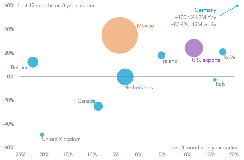 The U.S. beer industry has been steadily losing market share in the broader drinks market, with the Boston Beer Company flagging growth of just 1% in the past quarter on a year earlier. While imported beer sales growth has been doing better, U.S. imports of beer fell 7.9% on a year earlier in April, Panjiva data shows, resulting in a three month decline of 2.6%. That marks a step back from a longer-term trend of growth that has seen imports rise 21.3% over the past three years.
