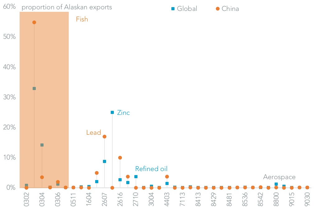 Alaska is particularly exposed to food exports, with 49.2% of its total exports and 60.2% of its exports to China in 2017 having been accounted for by fish, Panjiva analysis of official data shows. Other major export lines that may be at risk include lead (17.0% of China-bound exports) and forestry (3.6%), while opportunities to increase exports include zinc (24.9% of global exports, none to China) and oil products (3.6% vs. none).