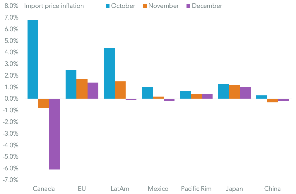 U.S. trade price inflation slowed once more in December, with import prices tipped into deflation in December for the first time since Oct. 2016 on a year over year basis, Panjiva analysis of official data shows. That was largely down to fuel prices though excluding food and fuel import prices still only increased 0.6%, the third month they were under 1% point. On the same basis export prices rose 1.2%.