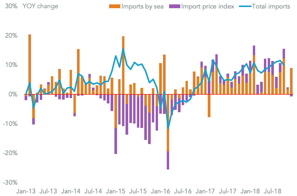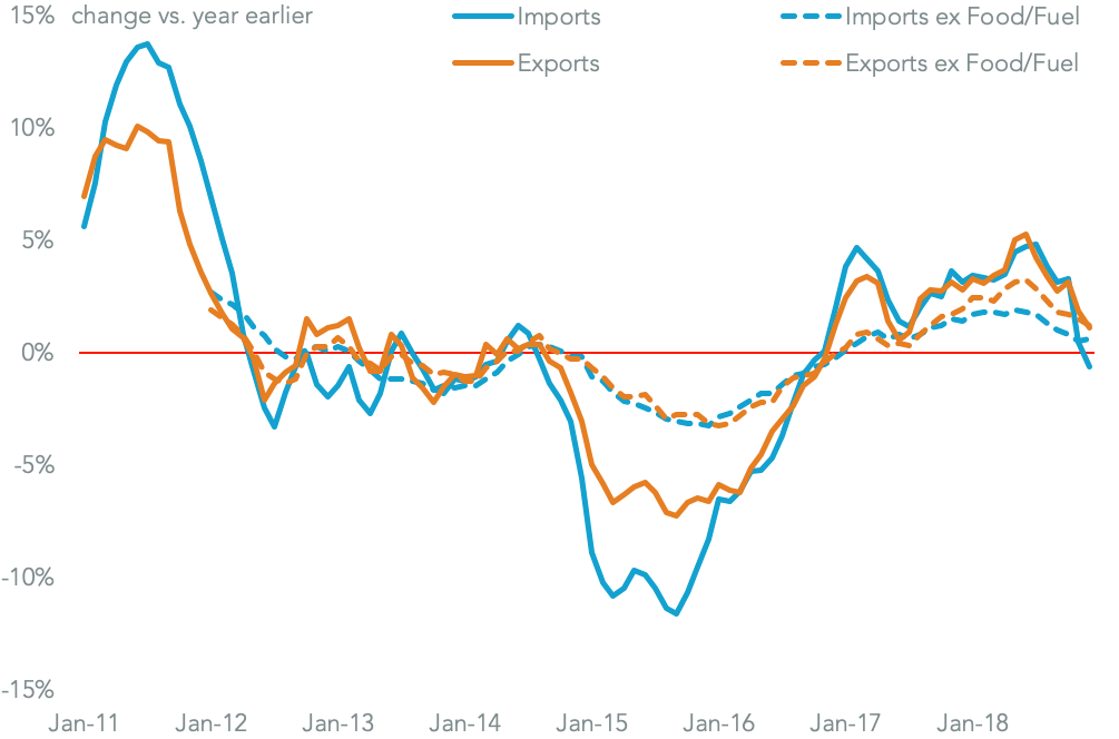 The slide in import prices in recent months has been due in part to lower prices on imports from China, a reaction to tariffs that were imported under the section 301 review of Chinese IP practices. Price inflation for imports from China fell 0.2% on a year earlier following a 0.3% decline the prior month suggesting exporters to the U.S. have cut prices to partly offset higher tariffs for customers. That’s consistent with corporate commentary on price cuts, as outlined in Panjiva research of Jan. 10.