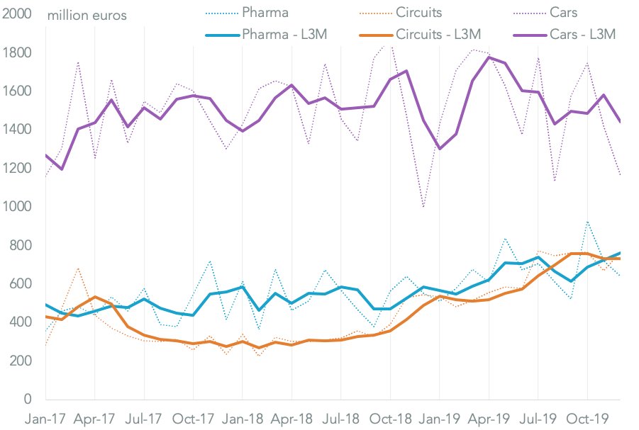 Aerospace represented 5.5% of exports while electrical circuits accounted for 7.75 billion of exports. The latter surged by 80.5% year over year in Q4 and will likely reverse given China’s factory closures.