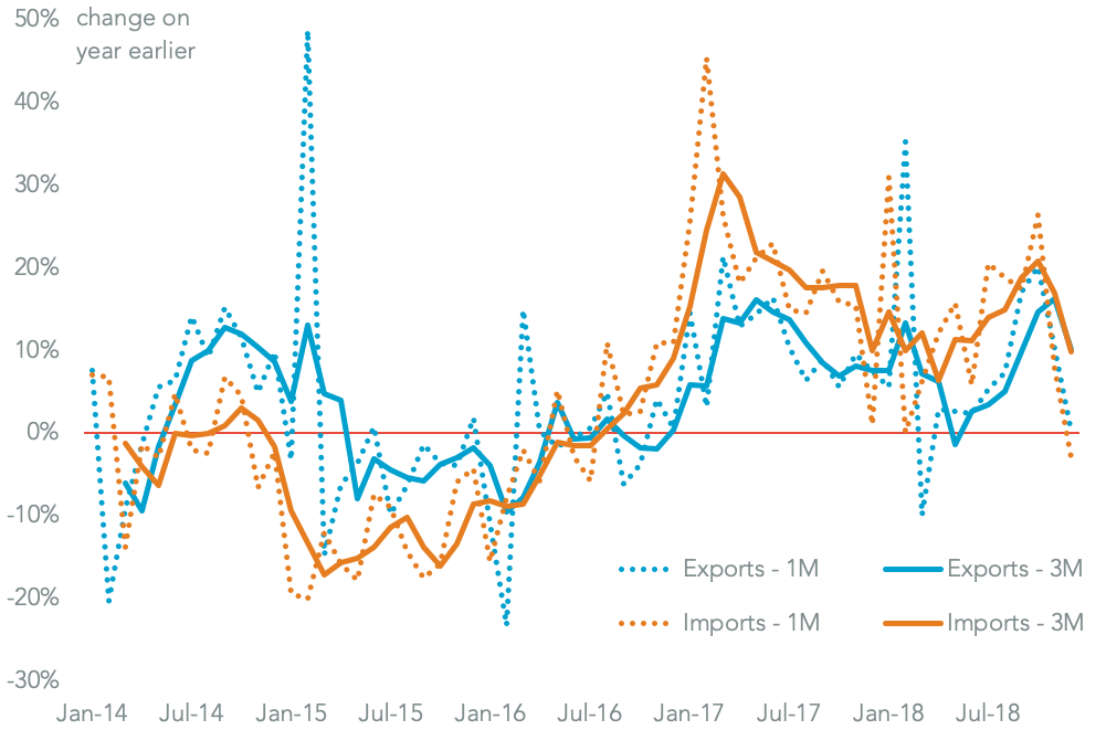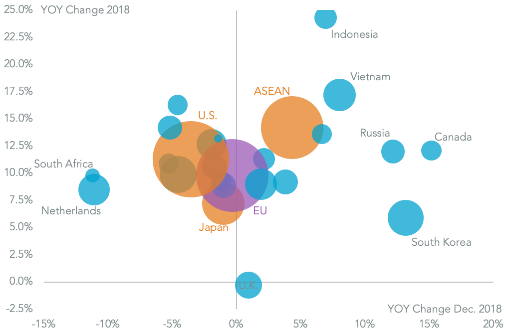 Perhaps unsurprisingly a major culprit was trade with the United States. Exports to the U.S. fell 3.7%, the first non-seasonal decline since Oct. 2016. That would indicate an end to the pre-tariff purchasing rush by U.S. buyers following an agreement between President Xi Jinping and President Donald Trump at the start of December to hold-fire on increases while trade negotiations take place. Exports to the U.S. had previously climbed by 12.3% in the prior three months.