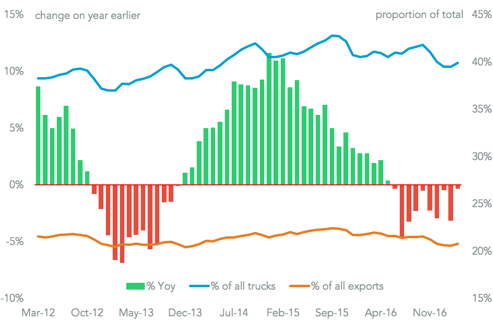 Panjiva data shows exports from Mexico via Nuevo Laredo accounted handling for 39.9% of truck exports and 20.8% of total exports in the three months to March 31 in number of shipments. A resurgence in handling had been on the way – shipments in March were 5.4% higher than a year earlier even though the first quarter in total saw a 0.4% decline. Key consignees may face disruption include consumer products groups Colgate-Palmolive and Procter & Gamble and manufacturers such as Johnson Controls and auto-part supplier Lear.