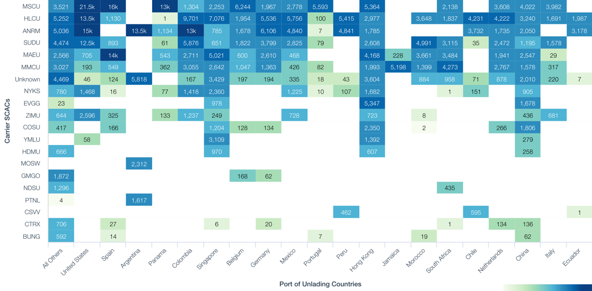 The dominant shipper that Terminal Link will need to negotiate with is Maersk which, along with Hamburg Sud and Alianca, has a 37.8% of terminal traffic in the past 12 months. That’s a common position for Brazil more broadly, as outlined in Panjiva research of December 19. MSC is number two with 20.5% and Hapag-Lloyd third (17.2%). CMA-CGM meanwhile is a distant fourth at 6.7%, though it is a leader on niche routes into the Caribbean and South Africa. Its purchase of Maersk’s cabotage line, Mercosul, will also increase its importance in the region.