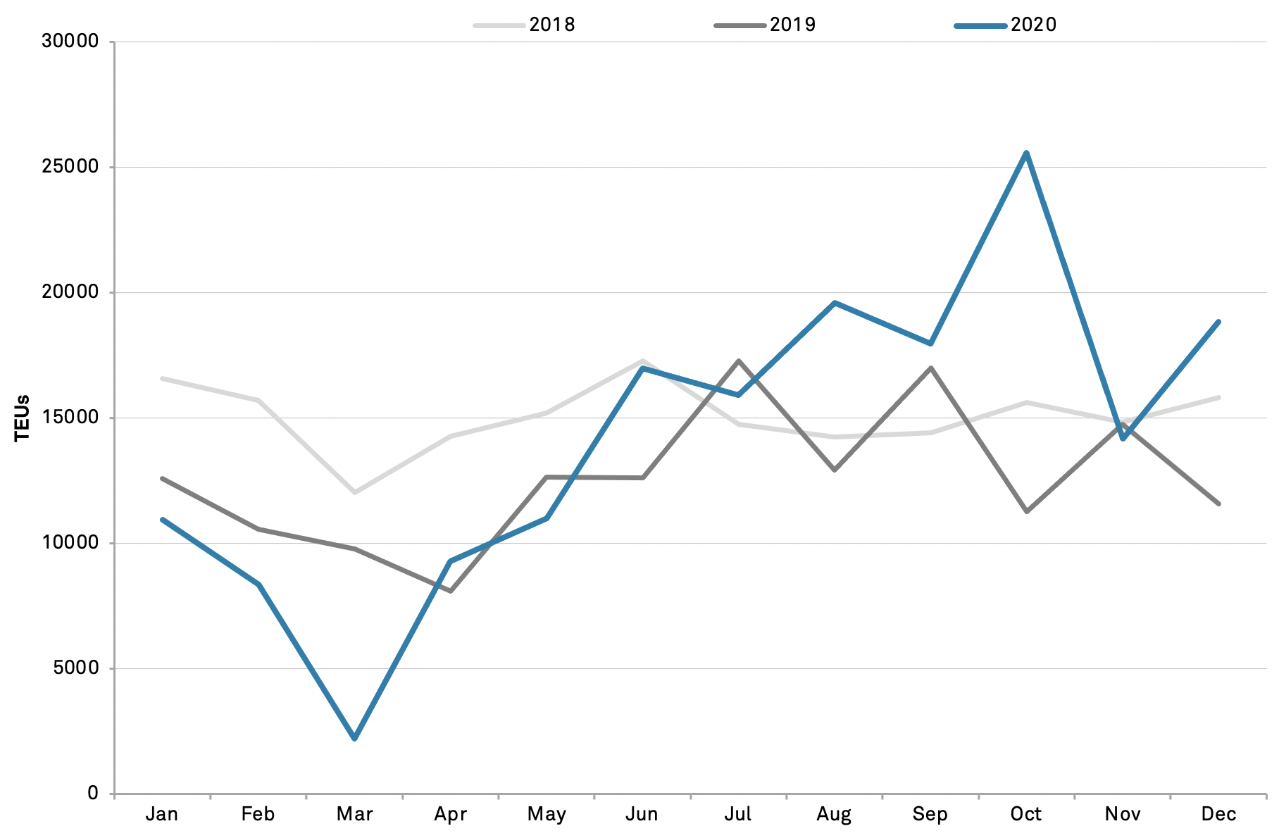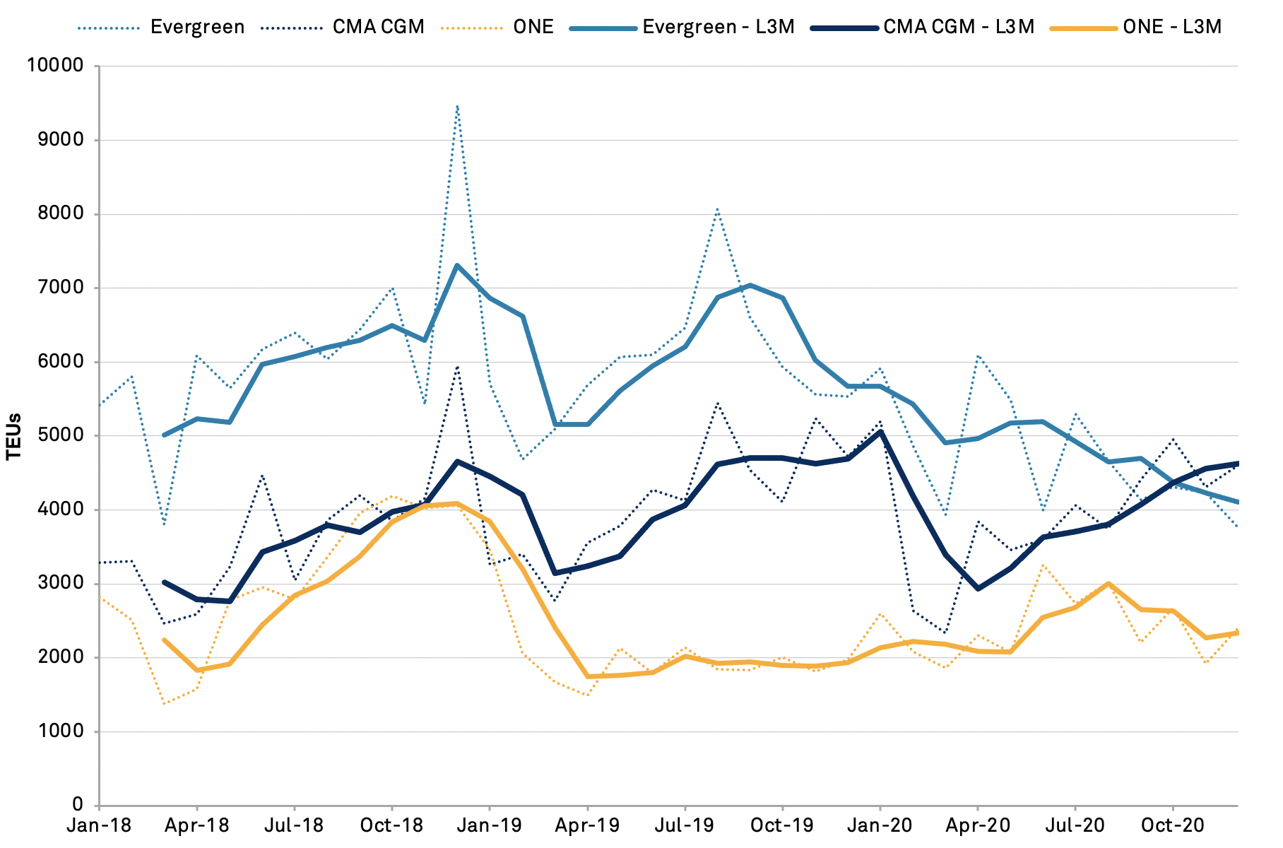 Panjiva’s data shows that shipments from Yantian to Los Angeles handled by CMA CGM, the main lane for the SeaPriority but including all CMA CGM services on the route, have surged since the service’s introduction in fall 2020. Imports in Q4’20 climbed 55.7% year over year, while shipments in the first three weeks of January jumped 73.0% year over year. The latter may also reflect vessels that had been held up in December due to congestion being unloaded later than expected.