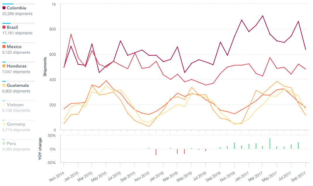 Global coffee exports slumped 14.8% on a year earlier in September, Panjiva analysis of ICO data shows. That was the first drop since July 2016, while shipments of 8.34 million bags was the lowest in at least three years. The drop was entirely accounted for by a 14.8% drop in shipments from Brazil – the ninth straight decline – while shipments from Vietnam collapsed by 39.8%.
