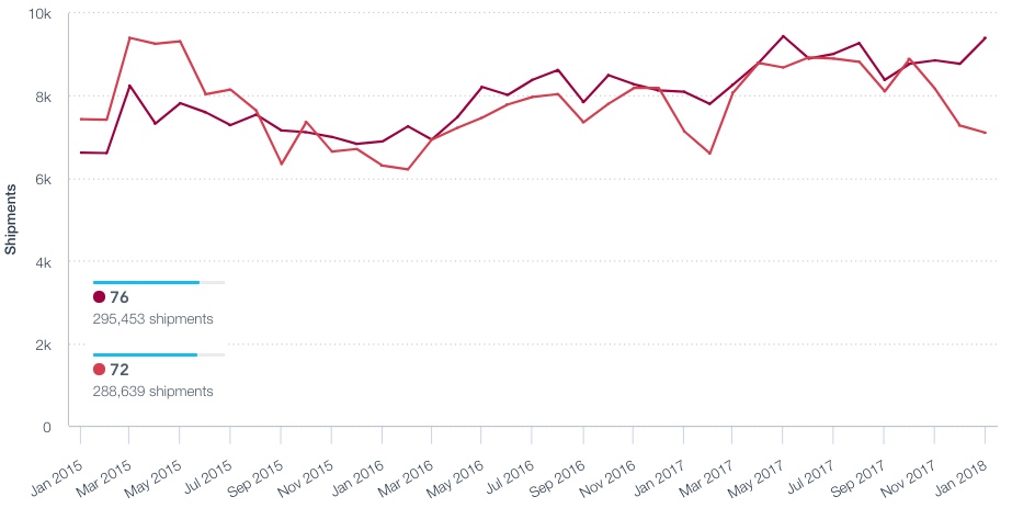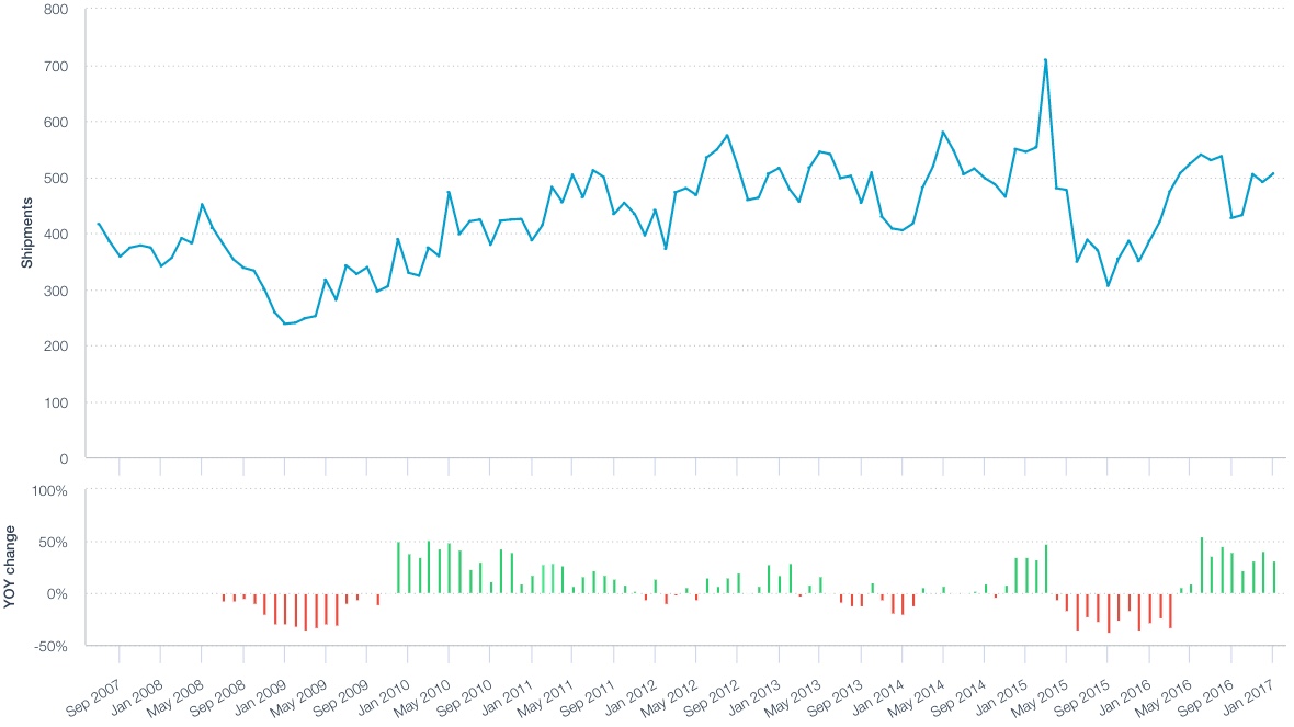 The most “shovel ready”of these would be to enact the – as yet unknown – results of the section 232 reviews of the steel and aluminum industries. Aluminum buyers may be more concerned about the outcomes than steel buyers. Panjiva data shows seaborne imports of aluminum products from outside Canada and Mexico climbed 16.1% higher in January on a preliminary basis vs. a year earlier and were 6.8% higher than the prior three months, perhaps indicating a build-out of inventories. Imports of steel meanwhile were unchanged on a year earlier, and 12.4% down vs. the fourth quarter.