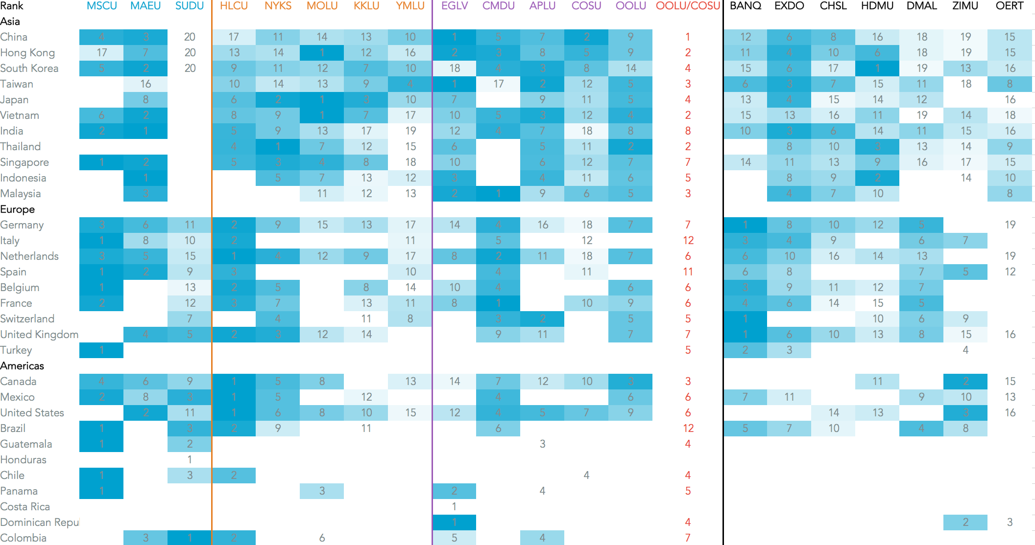 From a revenue perspective the “cross-selling” opportunities may be minimal. The two group’s revenues have a similar mix geographically. Panjiva analysis of COSCO and Orient Overseas’ financial reports shows. COSCO is slightly less exposed to Trans-Pacific traffic (14.8% of the total vs. 26.3% of Orient Overseas) but more exposed to Asia-Europe (21.6% vs. 16.0%). The move would not address shortfalls in both companies’ Transatlantic operations.