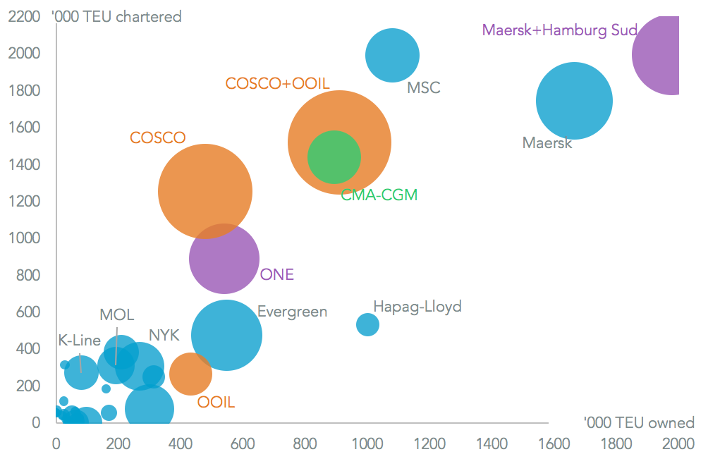 COSCO Shipping has announced plans to acquire Orient Overseas for HK$49.2 billion ($6.3 billion). The combined entity will be the third largest globally by capacity – including owned and chartered capacity currently in service, Panjiva analysis of Alphaliner data shows. The combined group will also have the largest expansion plans at 631,600 TEUs. Once all container-lines complete their current plans it will be just 5.6% smaller than MSC.