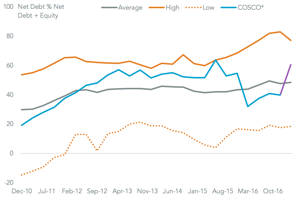 The deal will be full debt financed on COSCO Shipping’s part, though it has a co-investor who will take a 9.9% stake. That leaves COSCO Shipping needing to finance $5.8 billion of new debt on top of its existing $6.81 billion of debt and Orient Overseas’s existing $2.1billion. The resulting gearing, measured as net debt vs. total capital, will be 60.4%. That compares to COSCO Shipping’s 41.3% at the end of the first quarter and the industry average 48.4%. Credit rating company Lianhe currently rates the company’s debt as AAA with a stable outlook, the highest rating available.