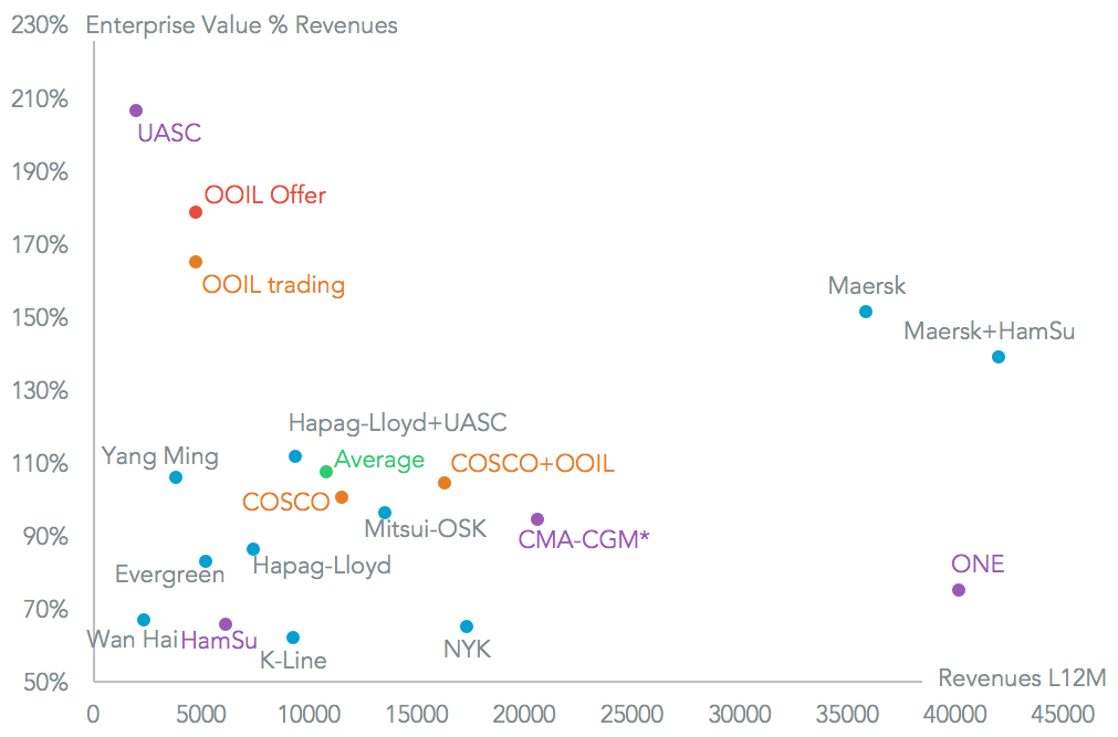 Financially the offer price of HK$78.67 was 38% above Friday’s closing price. Panjiva analysis of company financial data shows that the offer price is equivalent to a ratio of enterprise value (market capitalization plus net debt) vs. revenues of 179%. That compares to Hapag-Lloyd’s offer for UASC at 207%, Yildirim’s proposed sale of CMA-CGM at 94% and Maersk’s offer for Hamburg Sud at 65.6%. COSCO currently trades at a ratio of 101%.
