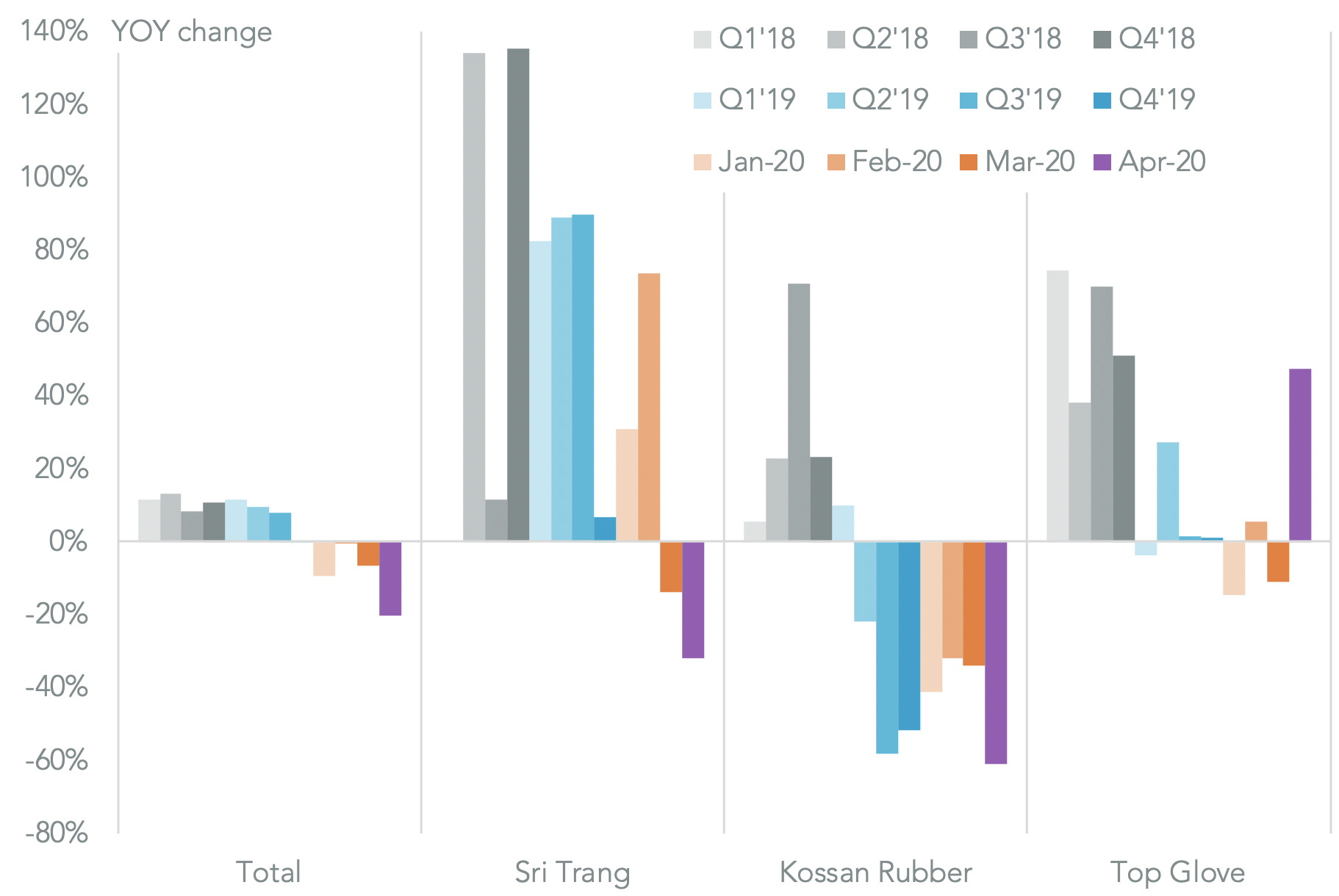 Total U.S. seaborne imports of rubber gloves meanwhile fell by 6.6% year over year in March and by 20.1% in the first half of April. Aside from the slide in shipments linked to Sri Trang there was a 61.1% slide in shipments linked to Kossan Rubber. The latter continued a longer-term downtrend and so may not be just COVID-19 linked.
