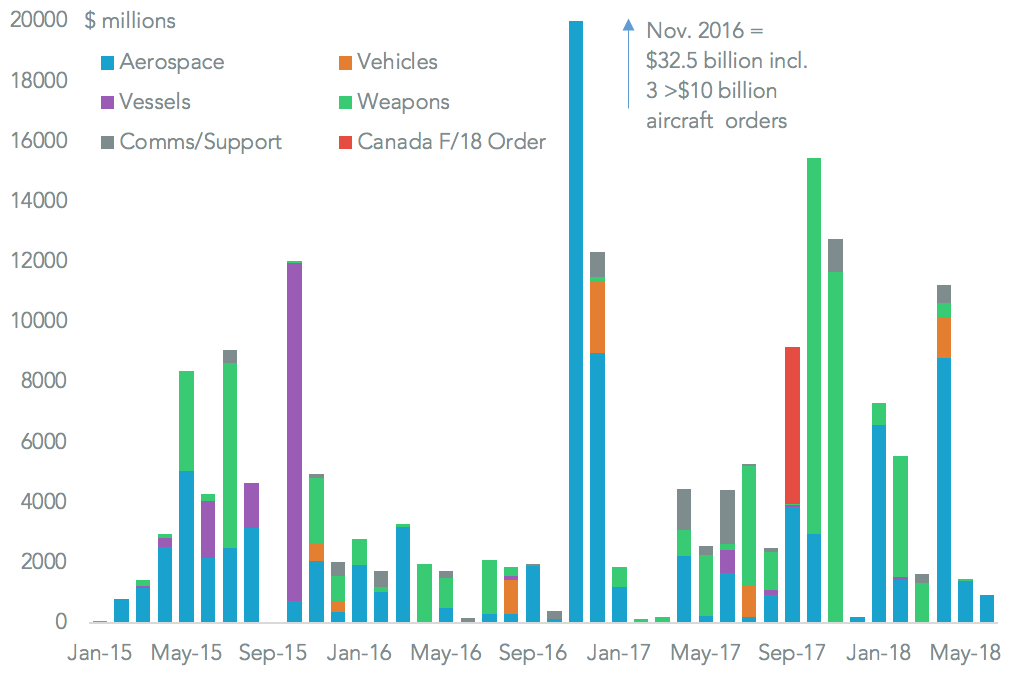 Chart segments export sales approvals by the U.S. Department of Defense by systems type. Calculations include DSCA data.  Source: Panjiva