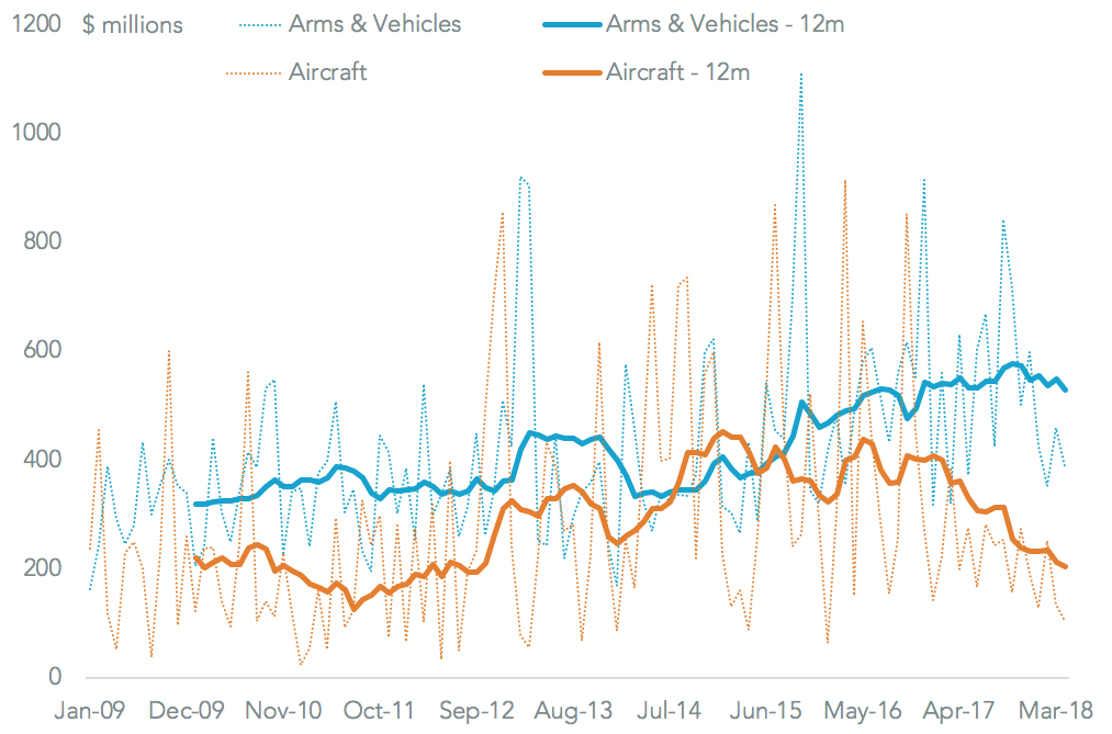 Chart compares U.S. exports of arms / military vehicles and military aircraft on a monthly (dotted) and annual average (solid) basis.  Source: Panjiva