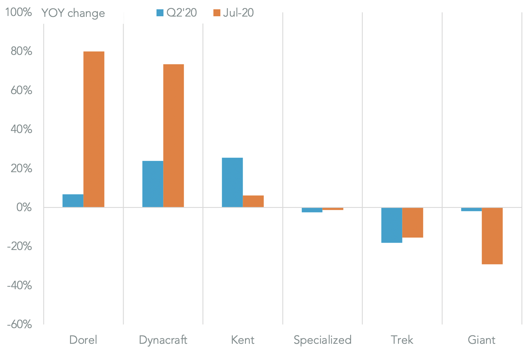 Bicycles have been in strong demand in the wake of the COVID-19 pandemic. Bike manufacturer Giant reported a 22.9% year over year surge in sales in Q2, S&P Global Market Intelligence data shows. Similarly, diversified leisure goods manufacturer Dorel reported an 8.1% year over year increase in revenues in Q2 including an 18.5% surge in sales by Dorel Sports, its cycle manufacturing division.