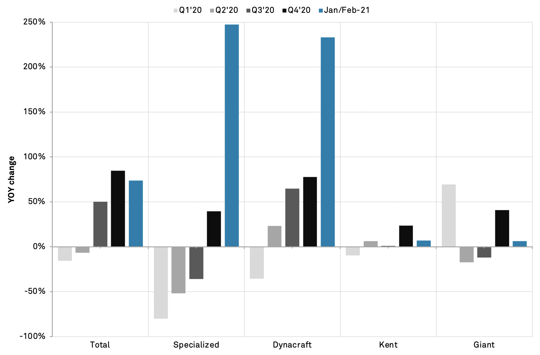 The most recent expansion has been led by a 248% surge in imports linked to Roth Distributing’s Specialized brand, followed by a 233.3% increase in shipments linked to Dynacraft. Others have been slowing their shipments with imports linked to Kent and Giant rising by just 7.1% and 6.5% respectively in the past two months after increasing at a double-digit rate in Q4’20.