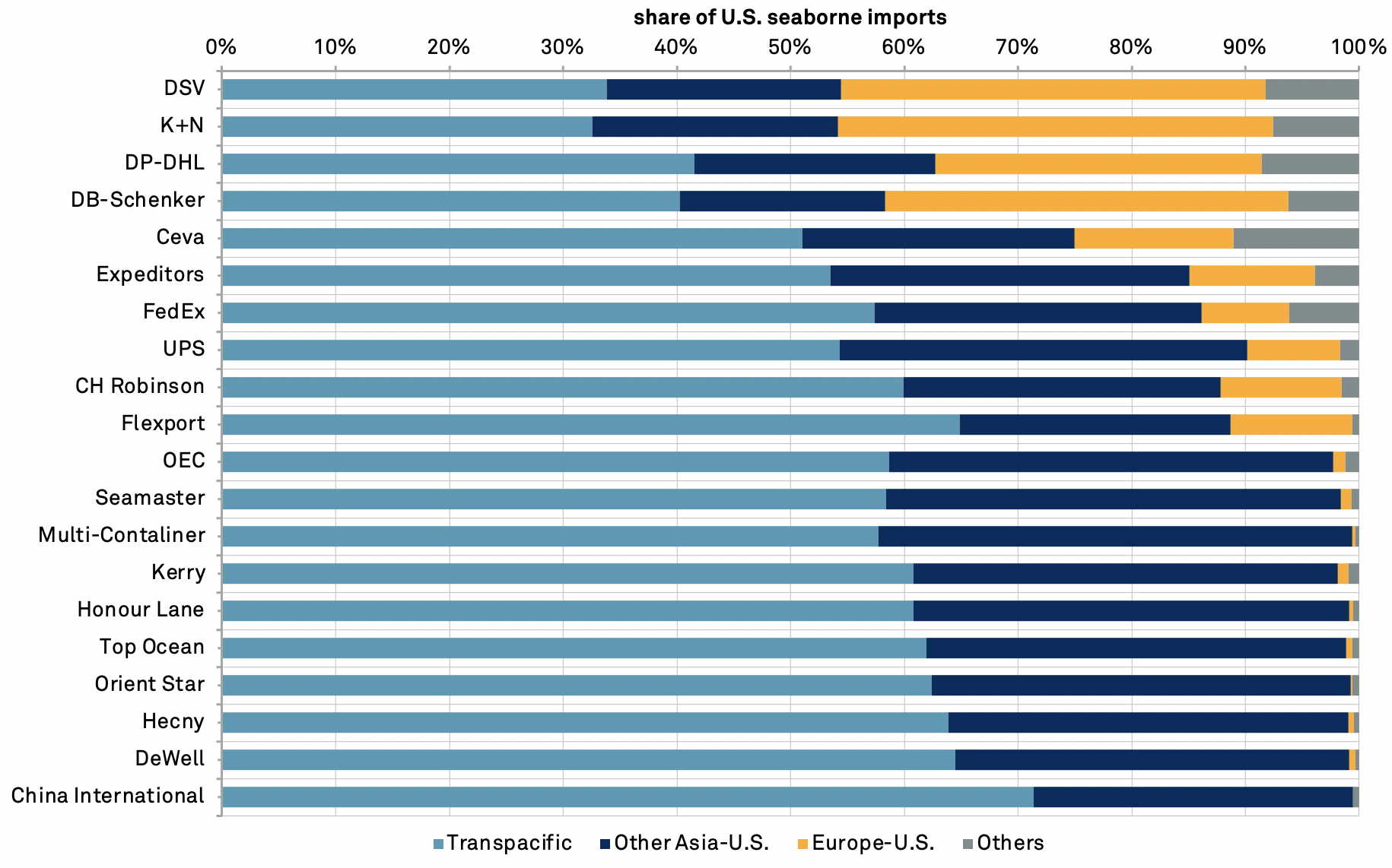 Transpacific routes accounted for 33.8% of imports, while imports from Asia ex-Transpacific accounted for 20.6% and Europe 8.3%. The next closest were K+N and DP-DHL as a result of their exposure to shipments from Europe.