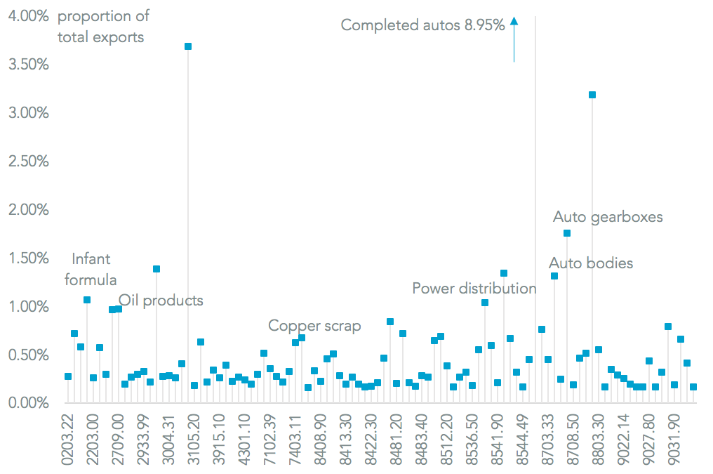 Panjiva analysis of the top 100 import lines from China shows the top products that tend to be shipped by sea from Europe to China include completed autos and parts, infant milk formula and power distribution equipment. That leaves the supply chains of companies as diverse as BMW and Daimler to Wyeth and Keller at risk.