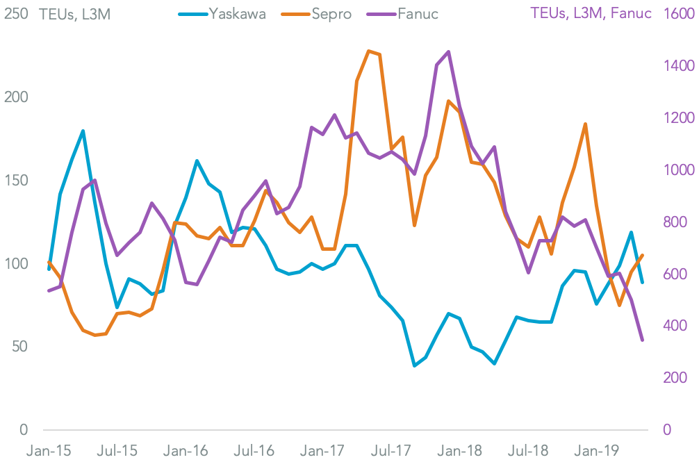 On a preliminary basis seaborne shipments suggest there was a further 5.6% year over year drop in imports in May. Among the major robotics importers to the U.S. the worst performer was Fanuc Corp. with a 41.0% drop in imports in 1Q, with the second quarter having opened with a 56.2% slide in April and May combined.