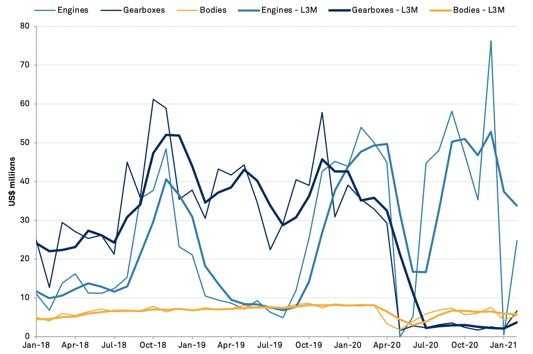 Ford’s Mexican parts operations have slowed significantly however, possibly reflecting a wider rearrangement of the supply chain. Shipments in total fell by 53.5% year over year in February after dropping by 80.7% in January. The decline has included reduced shipments of gearboxes and engines which declined by 81.1% and 54.3% respectively in February while shipments of body components dipped by 29.7%.