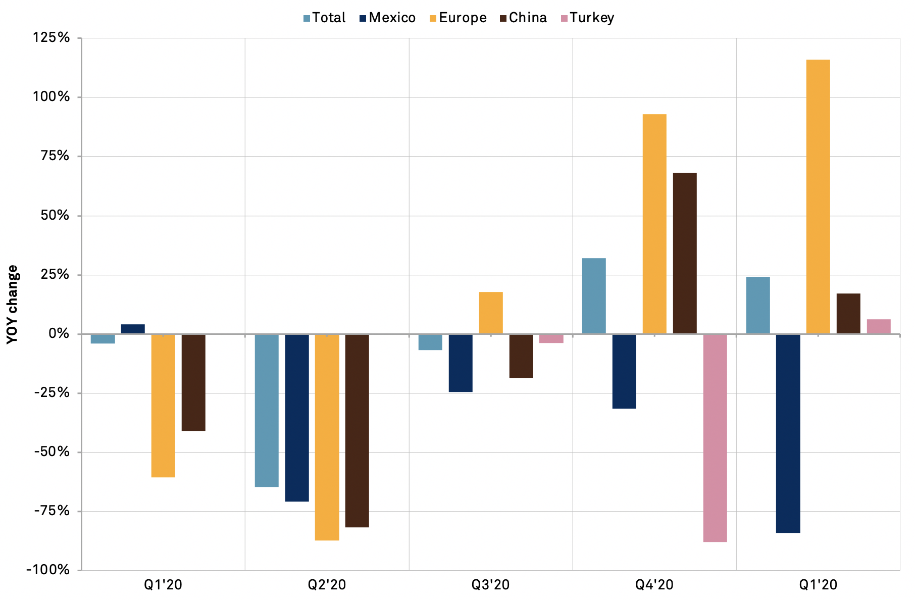 That brought the Q1’21 total to a 24.1% increase, raising the risk of oversupply of non-semiconductor parts. The ramp up in Q1’21 has been led by shipments from Europe which climbed 116.0% higher, while shipments from China rose by just 17.1% and those from Mexico declined.