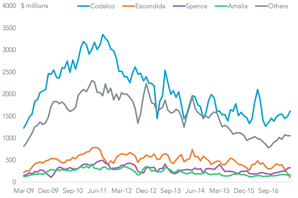 Increased sales of copper cathode to China would provide a welcome respite to Chilean producers after exports fell 16.4% in the three months to May 31. Leading producers have not performed equally. Number one producer Codelco experienced a 23.4% downturn in exports globally, while Escondida (owned by BHP and Rio Tinto) dropped 77.5% after a strike that has now ended The Australian reports. Escondida’s travail’s have helped other miners including Spence (which jumped 73.3%) and Amalia (13.0% higher).