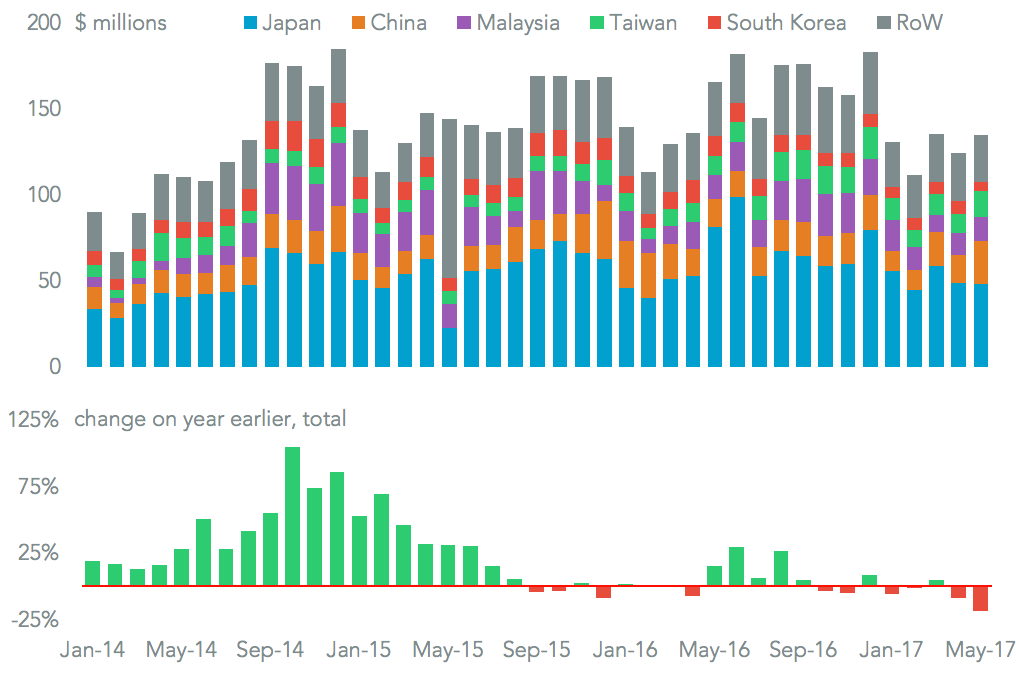 Panjiva data shows that Chinese imports of scrap machinery have already begun to fall after a protracted expansion. Imports in the quarter to May 31 fell 8.5% on a year earlier, compared to a 17.5% annualized growth rate over the past three years. The largest importers are electronics firms including Hon Hai, likely reflecting regulatory recycling schemes overseas, particularly for batteries.
